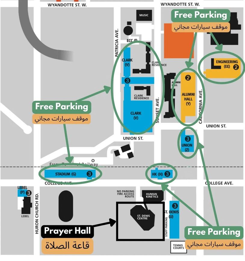 Free city parking is available on Sundays inshaAllah. All circled parking lots are free parking spots reserved by WIA for all those attending Eid prayers! Please note that parking at the corner of college and California is private parking - not included in the mosques free parking spots.