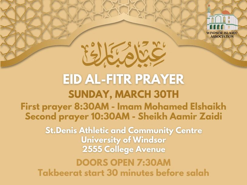 The Imams Council of Windsor has announced that Eid Al-Fitr will be on Sunday, March 30, 2025. We would like to extend our warmest Eid greetings to all of you. May Allah accept our fasting and prayers!